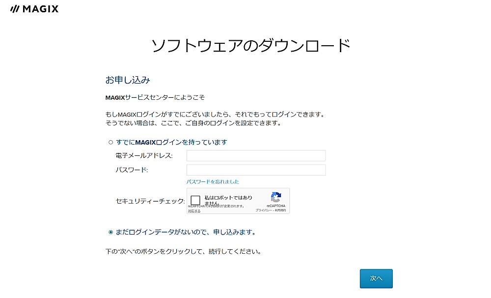 MAGIXサイトの「ソフトウェアのダウンロード」ページが開くので、MAGIXサイトにログインします。ここでのメールアドレスとパスワードは、ソースネクストとは別の物です(同じメールアドレスを使用した場合は除く、ただしパスワードは別)。初めての場合は新規作成します。