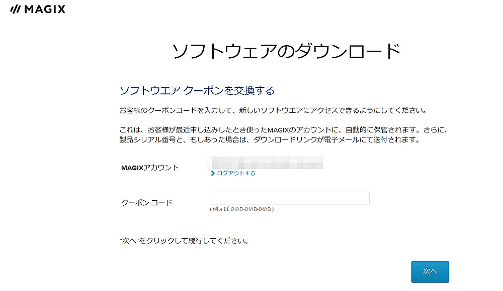 MAGIXサイトでログインすると、次にクーポンコードの入力になります。クーポンコードはソースネクストからVEGAS Pro 23を購入後に、メールで送信されています。クーポンコードを入力すると今度はMAGIXからVEGAS Pro 23用のシリアル番号と、インストールファイルへのリンクが記載されたメールが届くのでこれをダウンロードします(約6MB)。