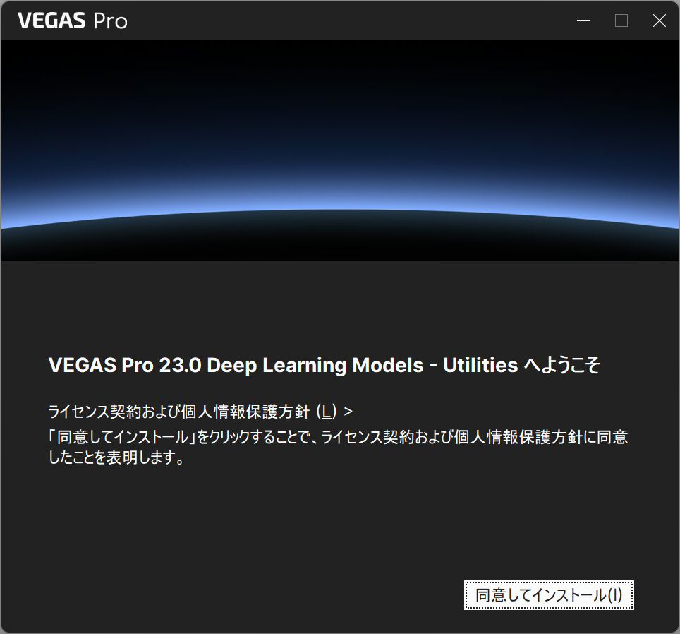 VEGAS Pro本体とディープラーニングモデルのダウンロードが完了すると、自動的にPCへのインストールが始まります。基本的にはこれまでのVEGAS Proと同様ですが、ディープラーニングモデルが機能別に分かれた為、その都度、言語選択とインストールの開始ボタンのクリックが必要になりました。詳しくはVEGAS Pro 22の時の記事にて。