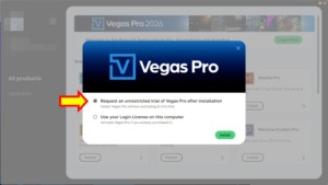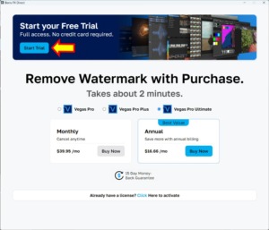VEGAS Proを起動(初回)すると、上記ウィンドウが表示されます。上部にある「Start Trial」をクリックします。
