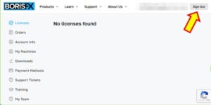 今後、おそらく「License」項目内にMAGIXに登録してあるVEGAS Pro等が反映されると思います。なお、サインアウトの際に上記矢印をクリックすると、なぜかBoris FXサイト内でページ遷移が繰り返し発生してしまいました。左上からBoris FXのメインページに戻って、ページ上部の人型アイコンからサインアウトすると問題ありません。
