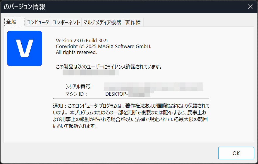 またMAGIXでは体験版もアカウントの製品情報に登録されていましたが、Boris FXでは製品情報に出てきません。アプリ側の製品情報を見ても、ライセンス情報はありません。PC名だけが表示されています。アプリ側で利用日数だけ管理してる?しかし残り日数が分からない…。※上記VEGAS Pro 23は体験版ではなく製品版です。